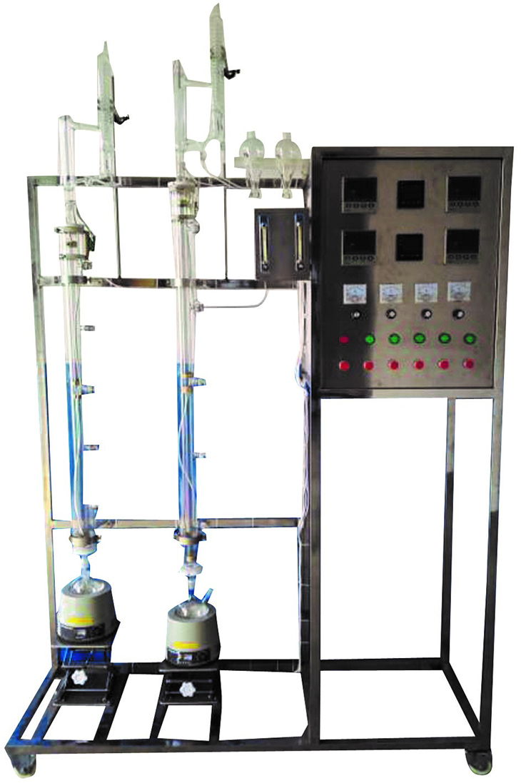 玻璃精馏塔、预热器、电加热器、流量计、温度传感器、温度仪表、不锈钢支架、不锈钢控制柜。 |