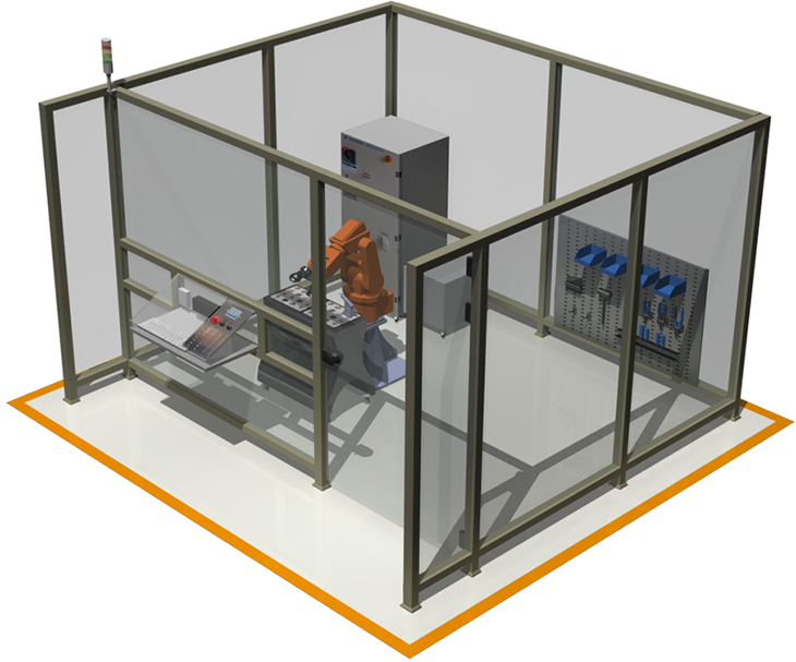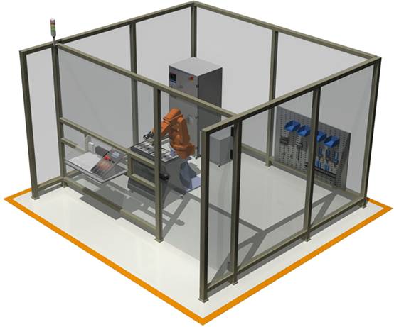 安全护栏:隔离护栏,高1000mm,框架采用2mm厚灰色栋梁铝合金型材,钢化玻璃10mm厚;工作站全部通透利于观察,玻璃中间没有隔断;并安装一个侧开门;门上安装安全检测元件,机器人自动运行必须在门关闭状态下进行;系统工作站安装有3个急停按钮,分别位于操作控制台、模型安装台、隔离护栏上,以备紧急情况使用。