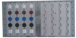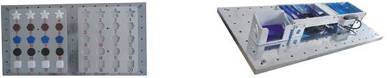 图块搬运模型:多形状物料搬运:机器人通过吸盘夹具依次把一个物料板摆放好的多种形状物料(方形、圆形、五边形、六边形、五角星)拾取搬运到另一个物料板上;圆形物料搬运:机器人通过吸盘夹具依次把一个物料板摆放好的物料拾取搬运到另一个物料板上;物料板可以水平固定到操作台,也可倾斜一点角度安装到操作台;圆形物料有两种,一种金属钱币形物料,一种单面锥形物料;每个物料板对应工位都蚀刻有物料编号;搬运形式可根据要求灵活组合,形式多样,能满足平面、斜面、阵列、指定编号位置、多种物料混合等要求;强化对机器人点位示教技能移训练。