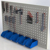 工具收纳墙:2.0mm优质厚钢网板制作而成,能固定于墙体上;有10多个工具位置,每个工具位置带有定制目视化管理标识,用于存放各种工具及螺丝螺母等零件,形象直观,存放方便,利于搬运,占用空间小,是工具零件存储保管的理想载体。