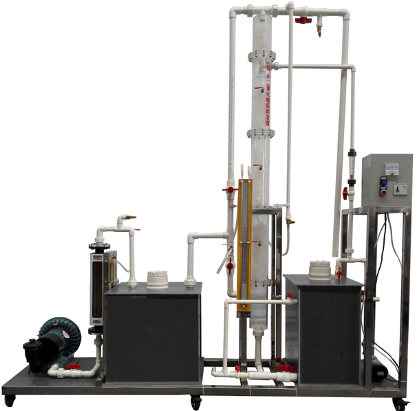 有机玻璃三段填料塔、液体缓冲箱、气体缓冲箱、进出口风管、涡轮气泵、喷淋系统、加液泵、气体流量计、液体流量计、SO2气体钢瓶及减压器(用户自备)、SO2气体流量计、电控箱、管道阀门、不锈钢支架。
