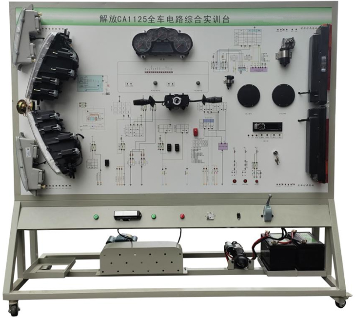 CA1125J全车电器教学板该设备采用解放CA1125J柴油机整车电器实物为基础,充分展示汽车仪表系统、灯光系统、雨刮系统、喇叭系统、发动机电器系统、起动系统和充电系统等汽车电器各系统的组成结构和工作过程。