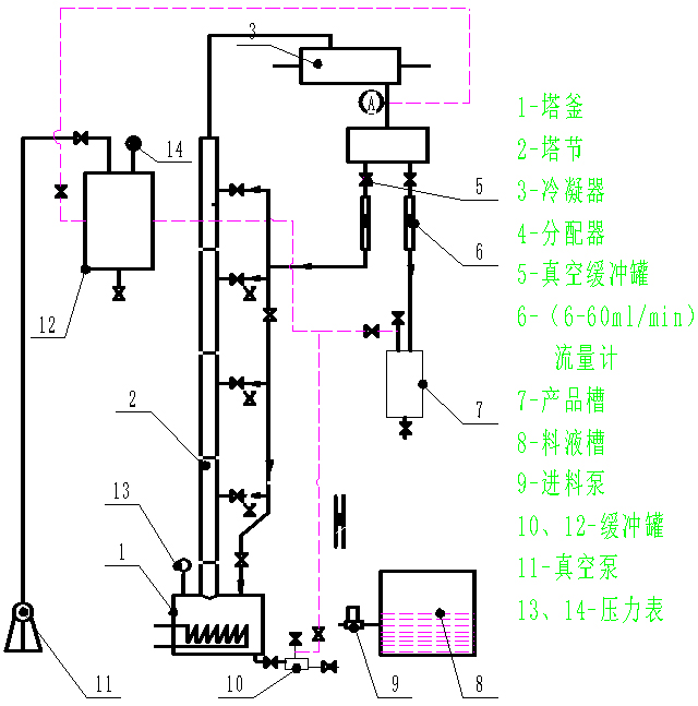 1、本实验装置主要由真空系统、真空缓冲罐、精馏塔、冷凝器、再沸器、料液泵、回流泵、压力表、产品罐、原料罐、流量计、温度仪表、温度传感器、316不锈钢管道和阀门及保温材料等组成。