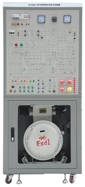 信号照明综合保护实训装置装置采用柜式结构,柜子上部分为铝面板,面板上绘制有电气原理图,并引出了相应观测孔,以供学生测试分析。下部分可放置ZBZ系列矿用隔爆型信号照明综合保护装置实物(用户根据教学需要进行选配,若不配也可作为储物柜使用),实物可配合铝面板上的资源进行短路、漏电、绝缘等试验。