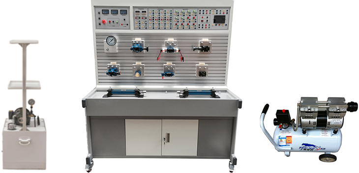 该实训台为铁质双层亚光密纹喷塑结构。美观大方,坚固耐用,操作方便。基本配置为:气动实训元件1套;PLC控制气动实训模块1套;低噪音空压机1台;液压实训元件1套,PLC控制液压实训模块1套;液压实训泵站1台。笔记本电脑(Win7系统 i7-10750H 1650Ti-4G独显)等组成。