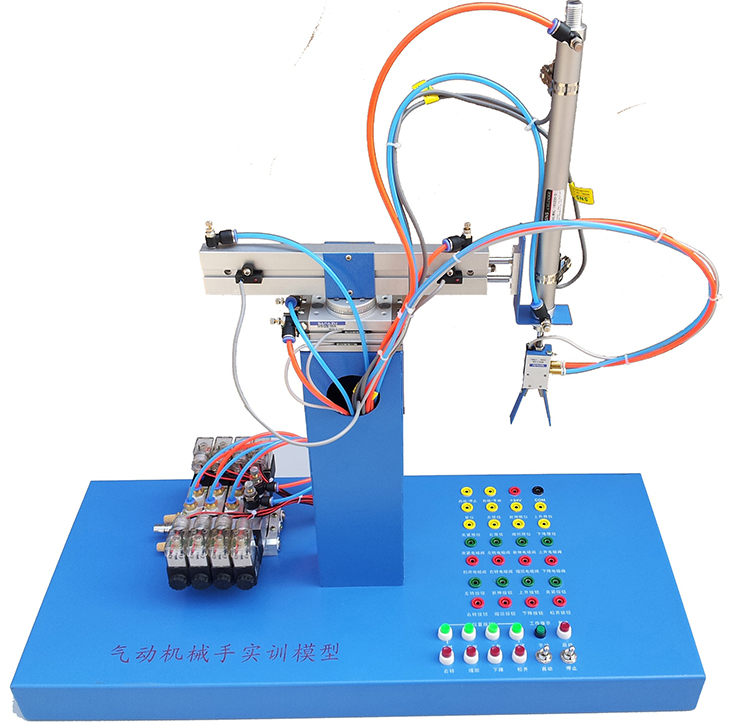 气动机械手实物模型:含回转气缸、双轴气缸、单轴气缸、气爪、电磁阀、调速阀、磁性开关、机械部件等,整个实训过程既可以通过上位机软件进行控制和实时监控又可进行手动控制。能开展对气动机械手的维护、设备操作及控制等技能训练,适合各院校《可编程控制器技术》、《PLC及其应用》等课程的实训教学