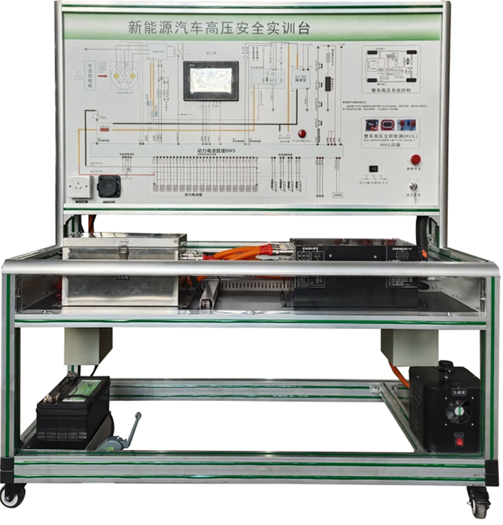电动汽车磷酸铁锂电池(带CAN-BUS通讯与电池管理器,带维修塞模块/绝缘检测模块)、7寸动力电池包触摸显示屏、放电指示灯、点火开关、模拟漏电开关、车载充电器(带CAN-BUS通讯)、国标充电枪与插座(带CC,CP信号)、电池高压安全管理系统(带CAN-BUS通讯)、霍尔式电流传感器、高压配电箱(带继电器与保险丝模块)、直流接触器(包含充电继电器、总正继电器、总负继电器、预充继电器)、DC-DC转换器、辅助蓄电池(12V45AH)、一体化全铝合金型材搭建的移动台架(1500×700×1700mm 带自锁脚轮装置,带安装检测端子的原理面板,面板1448×940mm)、设备操作说明书。