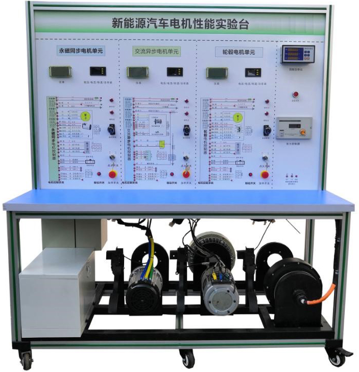 检测控制面板(装有各种检测端子,1448×940mm彩色电路图和工作原理示意图)、组合仪表、点火开关、电机控制器、车载充电器与充电接口、DC-DC转换器、锂动力电池组、电动车电机(包含三种电动车常用电机:60V2.2KW3000rpm永磁同步电机,60V2.2KW3000rpm交流异步电机,60V2KW3000rpm直流无刷电机)、刹车开关、档位开关、油门控制装置、大电流继电器、电源总开关、急停开关、辅助蓄电池(12V45AH)、电机性能检测系统(数显电压电流表、转速表、扭矩表、功率表、磁粉制动器、测试上位机软件)、电机及扭矩传感器与磁粉制动器连接器、SX-96B数显表、一体化全铝合金型材搭建的移动台架(1500×700×1700mm 带自锁脚轮装置,带安装检测端子的原理面板,面板1448×940mm)、故障考核系统、设备操作说明书。