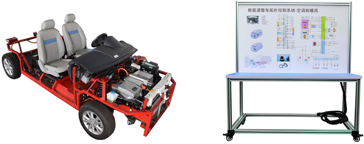 经拆卸车身的纯电动整车底盘总成等;配置教学资料与维修资料、配原理教学面板六套(包括:驱动传动系统、动力电池和管理系统、电动转向助力、空调和暖风系统、电子真空制动系统、车身电气系统的教学功能)、故障模拟与排除装置、设备操作说明书。