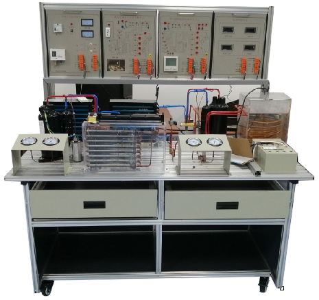 实训桌采用工业标准铝型材件与钣金结构件拼装而成,结构坚固,造形美观大方;设有二个大抽屉,用于放置实训导线或工具等。实训桌台面用于放置热泵型家用空调和空气源热泵系统的元器件并提供一个宽敞舒适的工作台面,学生可以在工作台面上将制冷系统的器件任意安装,实训桌还设有四个万向轮,便于移动和固