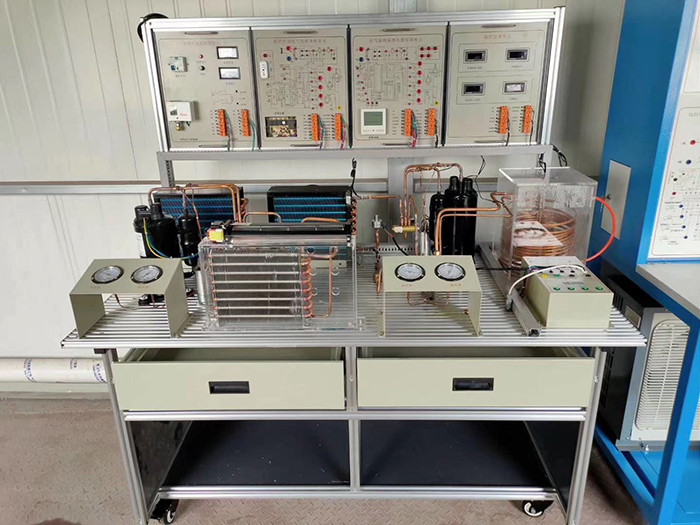 制冷热泵与空调系统技能实训设备该产品包含了制冷、热力学、传热学和电气控制等技术,主要由热泵型家用空调系统和空气源热泵系统两大部分组成。在铝合金导轨式实训台上安装冷凝器、蒸发器、节流装置、压缩机、控制电路等,构成一个典型的制冷装置,电气控制采用挂箱式,能进行制冷系统的组装、调试、运行,真实呈现制冷装置的工作过程,通过对制冷系统的安装、保压、检漏、抽真空、电气连线、加氟、系统调试及工况调整等,完成对学生的现代制冷与空调系统设备安装、调试和维修技能训练。