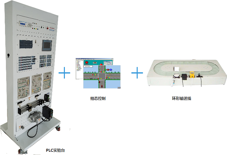 开放式多功能PLC教学实验系统由PLC工作台、组态软件、环形输送线以及远程控制实验系统等部分组成(如下图所示)。其中PLC工作台集成了PLC控制、电源管理、触摸屏人机交互单元、变频驱动单元、步进驱动单元等几部分功能模块。环形输送线是根据实际生产线中的一段为原型简化而成,是一个典型的物品识别与分拣系统,配有红外传感器、电涡流传感器、霍尔传感器等与可完成速度测量、产品计数、磁性物品识别等实验等。
