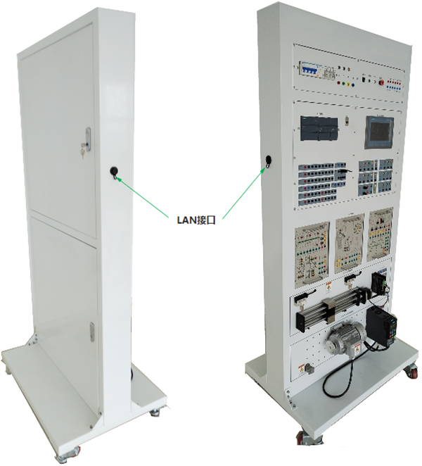 该教学实验系统支持以太网连接,PLC可编程控制器、HMI触摸屏和交流变频器均通过PROFINET基于以太网进行通信;PLC工作台之间可通过台体左右两侧的LAN接口(PN口)进行级联,构建由多台组成的PLC控制网络,从而实现网络化实验教学。