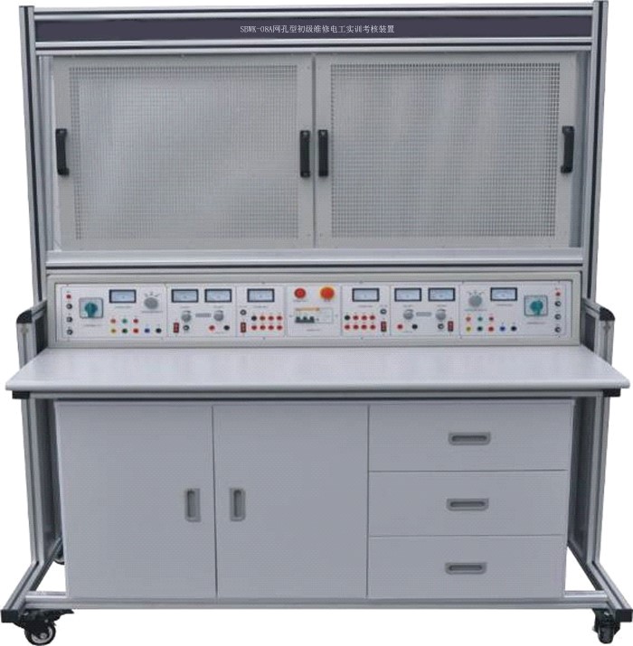 网孔型维修电工实训装置主要由实训桌、网孔板、实训元器件(也可自购)组成。学生根据实训线路进行元器件的合理布局,安装、接线全部由学生自行完成,接近工业现场。能完成机床线路,电机控制线路,照明配电的模拟操作、安装调试的综合实训,训练学生动手能力和实操技能。实训项目可自行确定,根据所选的项目选择相应的元器件。该装置也可作为电工考工的考核设备。