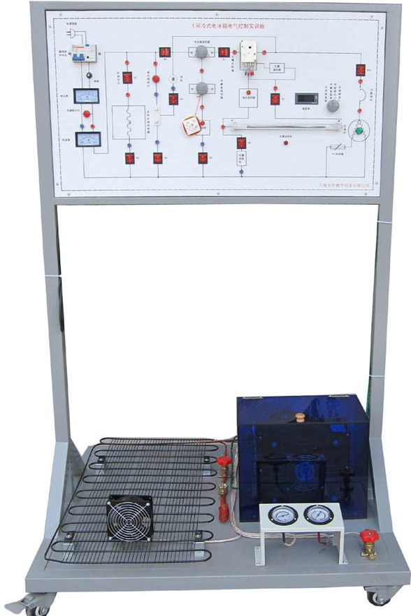 实训台提供冰箱制冷压缩机、直冷式蒸发器、钢丝式冷凝器(17档)、冷凝风扇(间冷风机)、照明灯及门开关、定时化霜时间继电器、补偿电热丝、补偿开关、温控器(WDF型、WPF型)化霜温控器(-5℃