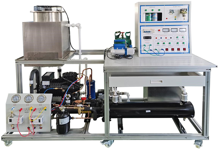 制冷与空调运行操作实训设备根据《制冷与空调设备运行操作作业安全技术实际操作考试标准》研发。采用蒸汽压缩式制冷循环系统,配备全封闭式制冷压缩机、冷凝器、蒸发器等制冷系统真实部件,并设有智能温度调节仪、流量计、压力表、电压表、电流表等测量仪表。考核以实际操作、仿真模拟操作完成。