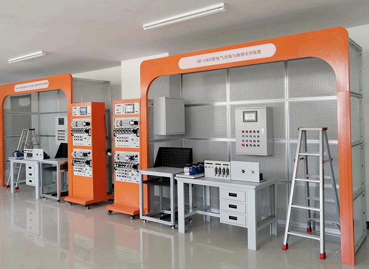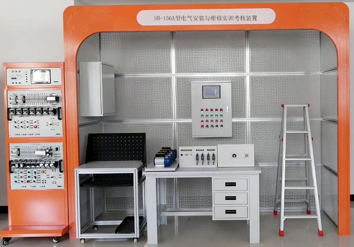 电气安装实训装置,电气安装实训设备,电气安装与维修实训装置,电气安装维修实训设备,电气安装与维修实训考核装置,电气安装与维修实训考核设备,工厂自动化行业:电气自动化设备、机电设备电气控制系统安装与调试、维修等;如:机床电气设计、安装、调试和维修、自动化生产线电气控制系统设计、安装调试和维修等。是根据工厂电气安装和室内电气安装等维修电工和电气安装工实训鉴定要求,而开发的一种通用实训平台。非常适合于各类职业院校和技工学校维修电工和电气安装工、其他有电气安装布置要求的专业的作为公共平台使用。采用钢制网孔板和钢制专用型材组接而成,安装有自锁式脚轮,方便移动和使用。装置表面喷塑,色彩稳重。装置配有专用电源台。装置设计高度以人站在一级人字梯即可方便操作的高度,既安全又能使使用者感受到施工现场环境。横向、丛向宽度合适,可以模拟现场线路的转向布置。网孔板可以方便拆下。为方便隐蔽工程施工,钢制框架仿建筑隔断用轻钢龙骨的加大宽度精心设计,带有穿管孔,使用扎带固定线管,在穿出网孔板时可以使用壁疏引出导线穿入明装底盒。配套的PVC管弯管器,可方便的对PVC管弯成90度。可进行电工安装。如桥架安装、PVC管安装、吊灯、白炽灯座、日光灯、开关、插座、配电箱、控制箱等,装置还包含有交流异步电动机、直流电动机、步进电机、、温度控制器、电偶、PLC、变频器触摸屏等控制与受控对象。该系统每个操作组配套一可移动式工具车和元件柜,便于对元件的保管和安装施工。从根本上解决了学校在普通墙面上进行的安装培训的使用不方便、实训范围窄的问题。具有组装灵活方便的特点,可以根据学校的实际教学条件组成,2人组、单面、度组合是基于2个0.8米的基本组合单元,辅助配有0.2米、0.4米的组合单元,形成不同的长度组合,以满足不同的教学场地。可以为水电安装工等有电气安装要求的各岗位群提供实训考核。