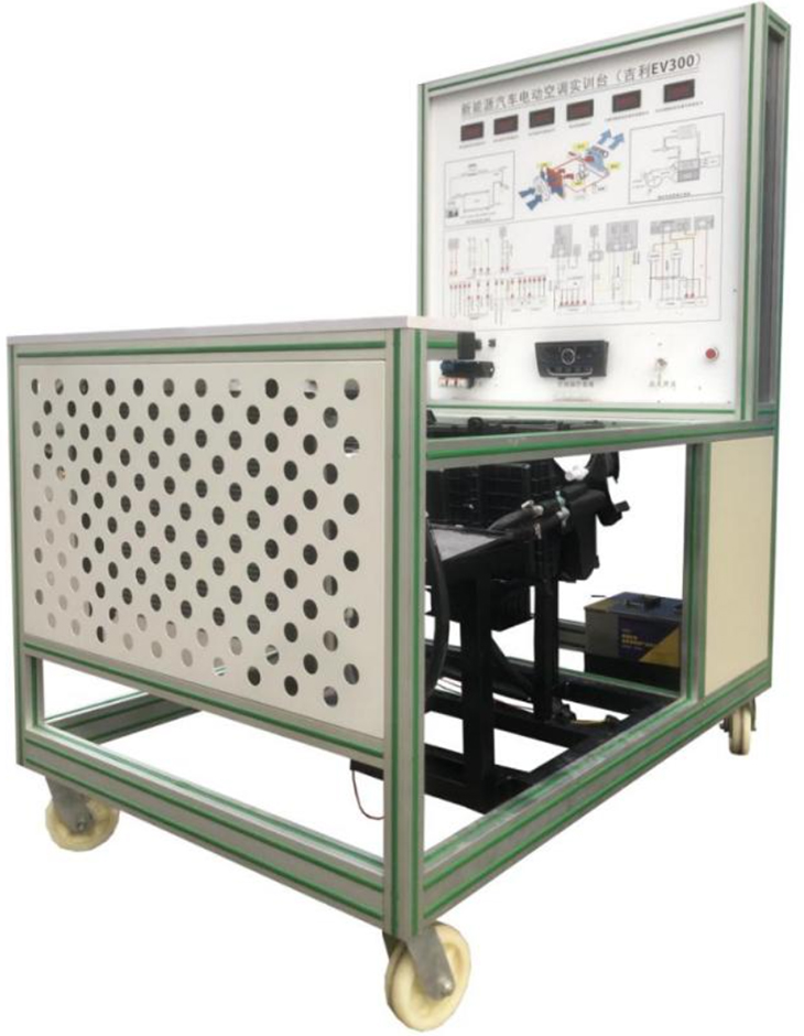 点火开关、电动汽车空调压缩机、膨胀阀总成、干燥器总成、鼓风机总成、冷凝器、冷却电子风扇、电动空调压缩机控制器总成、空调蒸发箱总成、充电器与充电接口、充电插线、DC-DC转换器、锂电池组、空调操作面板、高低压空调压力表、采暖模块总成、电源总开关、急停开关、直流接触器、辅助蓄电池(12V45AH)、一体化全铝合金型材搭建的移动台架(1500×1000×1700mm
