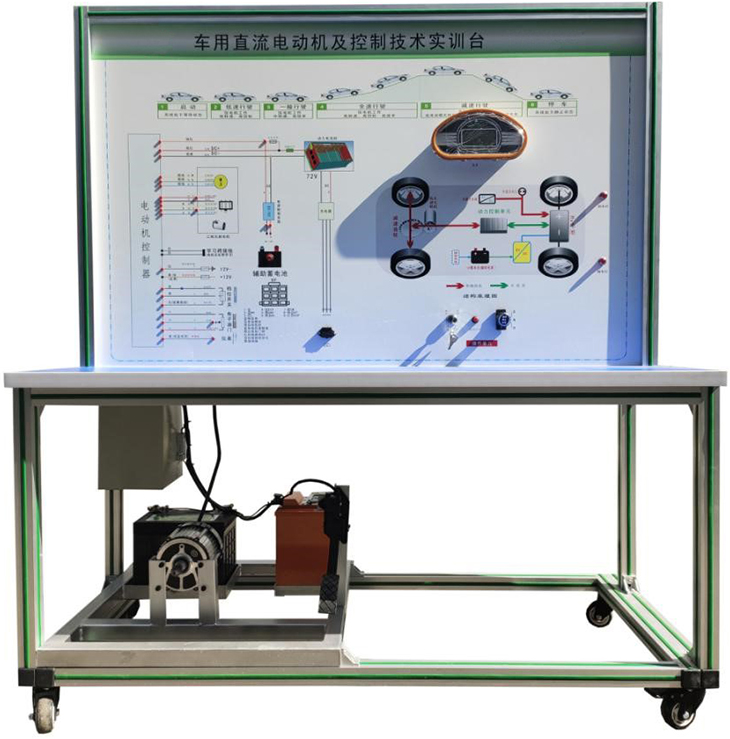 检测控制面板(装有各种检测端子,1448×940mm彩色电路图和工作原理示意图)、组合仪表、点火开关、电机控制器、车载充电器与充电接口、DC-DC转换器、锂动力电池组、电动车电机(直流无刷电机)、刹车开关、档位开关、油门控制装置、大电流继电器、电源总开关、急停开关、辅助蓄电池(12V45AH)、一体化全铝合金型材搭建的移动台架(1500×700×1700mm