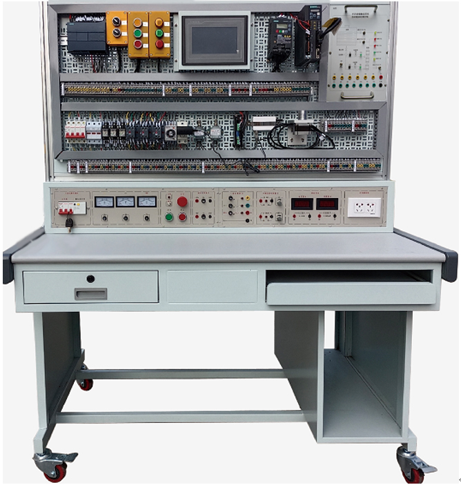 自动化控制技能实训台主要用于训练员工的自动化应用综合能力,训练内容包含:PLC通讯技术、PLC编程、触摸屏应用、变频器控制技术、伺服控制技术等。实训台底部装有带刹车的脚轮,方便移动和固定。电气元器件的布置应合理美观,并预留有一定空间,以便后期扩展其他培训内容。