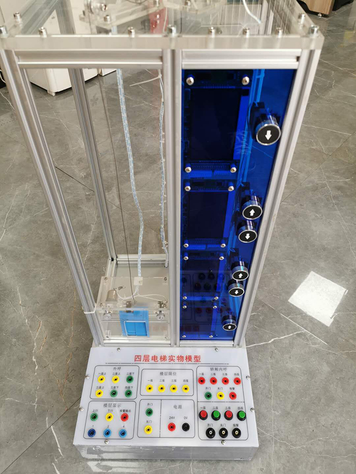 微型四层电梯模型,基本具备实际电梯的所有功能。具有轿厢的升降和轿厢门的开与关功能的拖动系统,可采集现场的各种信号,如内选按钮信号、外选按钮信号、平层、限位信号、厢门限位信号,实现各种方式下电梯运行的逻辑控制功能。可作为PLC、单片机的被控对象使用。具有性能可靠、运行平稳、操作简单、能耗低和便于实训教学。