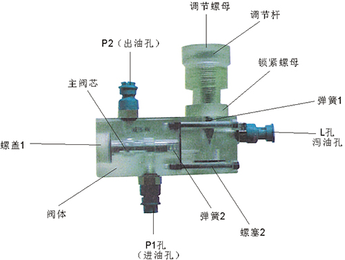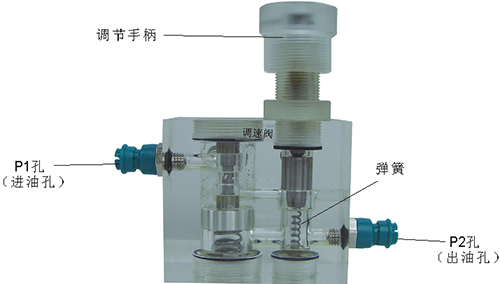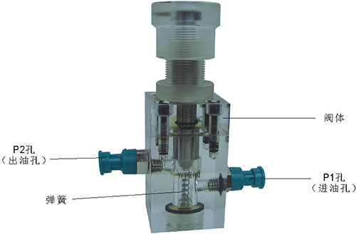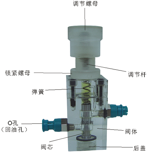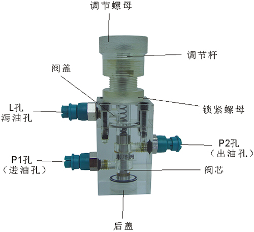 2、溢流阀结构上参考了国产P-63B型低压直动式溢流阀,其阀体阀盖、锁紧螺母、调节螺母、螺塞等采用了进口透明有机玻璃材料精制而成,阀芯、调节杆采用了45#中碳钢材料。并配合弹簧,油接头,密封圈等标准件装配而成,通过它可明确地观察到阀芯、弹簧、油孔等结构及其运行过程,具有形象逼真,性能可靠等优点。它即可作为教学模型,也可以作为液压实验元件进行实验演示。