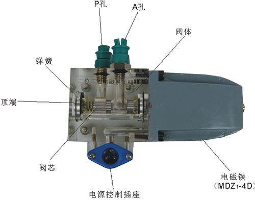 2、三位四通电磁换向阀结构上参考了国产34E-25B型三位四通电磁换向阀,其阀体、安装底板采用了进口透明有机玻璃材料精制而成,阀芯、推杆、定位套采用了45#中碳钢材料。挡板采用铝合金材料,并采用了MFZ1-4D型交流220V电磁阀(二只),配合弹簧,油接头,密封圈等标准件装配而成,通过它可明确地观察到阀芯、弹簧、油孔等结构及其运行过程。