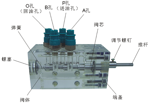 2、二位四通行程换向阀结构上参考了国产24C-25B型二位四通行程换向阀,其阀体、前端盖、螺盖采用进口透明有机玻璃材料精制而成,阀芯、推杆采用了45#中碳钢材料。配合弹簧,油接头,密封圈、内六角螺丝等标准件装配而成,通过它可明确地观察到阀芯、弹簧、油孔等结构及其换向过程。
