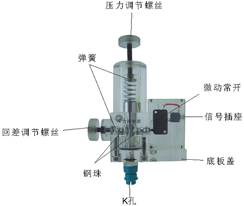 2、压力继电器其壳体,底板盖采用了进口透明有机玻璃材料精制而成,阀芯采用45#中碳钢材料,安装了微动开关及信号插座。配合弹簧,油接头,密封圈、钢珠、内六角螺丝等标准件装配而成,通过它可明确地观察到阀芯、弹簧、钢珠等结构及其在压力油作用下的运动过程和触点通断。