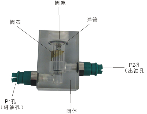 2、单向阀结构上参考了国产I--63B型板式单向阀,其阀体,螺塞等采用了进口透明有机玻璃材料精制而成,阀芯采用了45#中碳钢材料,并配合弹簧,油接头,密封圈等标准件装配而成,通过它可明确地观察到活塞、弹簧、油孔等结构及其运行过程,具有形象逼真,性能可靠等优点。它即可作为教学模型,也可以作为液压实验元件进行实验演示。