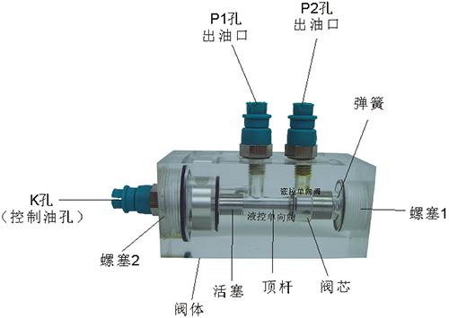2、液控单向阀结构上参考了国产IY-25B型液压单向阀,其阀体、螺塞等采用了进口透明有机玻璃材料精制而成,阀芯、顶杆采用了45#中碳钢材料,并配合弹簧,油接头,密封圈等标准件装配而成,通过它可明确地观察到活塞、弹簧、油孔等结构及其运行过程,具有形象逼真,性能可靠等优点。它即可作为教学模型,也可以作为液压实验元件进行实验演示。