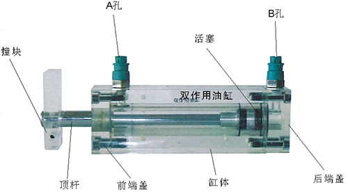 2、双作用油缸的缸体,端盖,行程撞块,撞块支承等均采用了进口透明有机玻璃材料。顶杆采用了45#中碳钢,并配合油接头,密封圈,内六角螺丝等标准件精制而成。能通过它明确地观察活塞、顶杆、油封、油孔等结构及其运行过程。