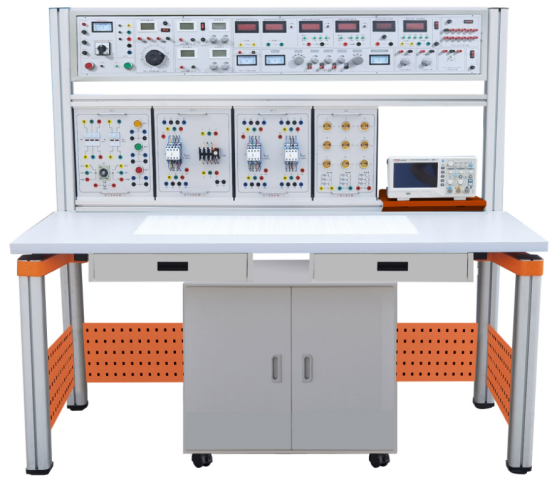 装置由主机箱、实验桌、实训屏、实训挂箱、移动矮柜、示波器架、学生凳等组成。实训装置支架与实训桌可组合、可拆装。支架与桌脚一体,铝合金结构,实训挂箱、各实验模块可根据实验需求自由组合放置。