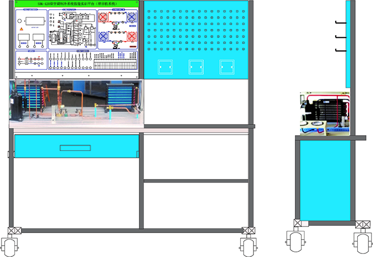 *1)L面左边为制冷电气原理控制挂箱,右上边为工具挂架,挂架开孔为标准式电工开口18MM,孔距28MM。可以放置标准的各种型号挂钩。以便放置制冷工具如:加力表。下层安装有电源插座等。